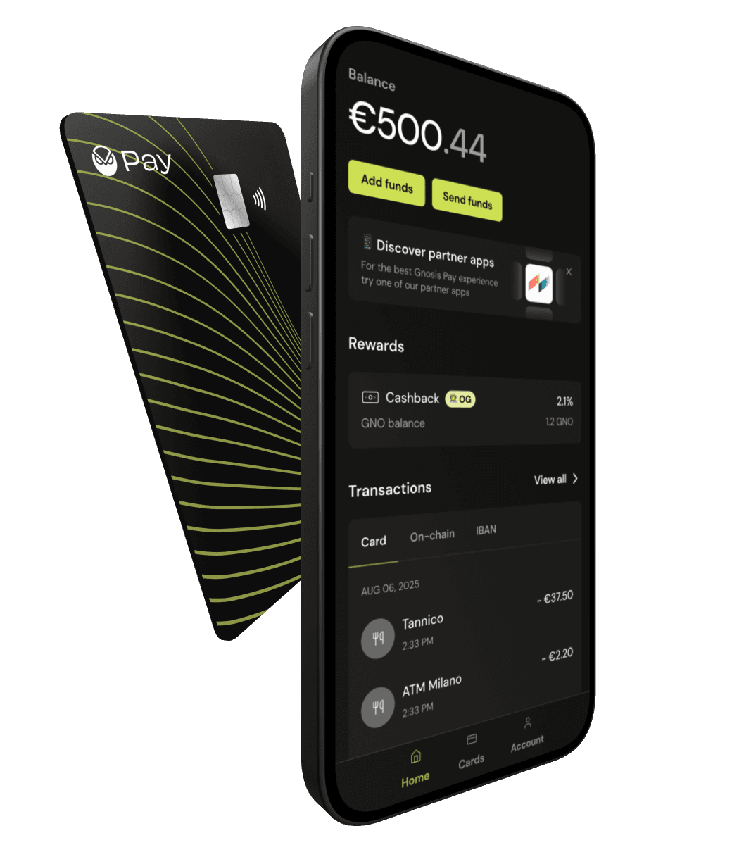 The Gnosis Pay Debit Card issued by Monavate Limited pursuant to licence by VISA Europe Limited. Monavate Limited is authorised and regulated by the Financial Conduct Authority as an Electronic Money Institution under the Electronic Money Regulations 2011 for the issuing of electronic money (FRN: 901097).